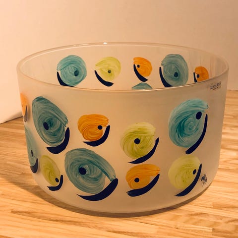 Kosta Boda glasvas med frostat glas och färgglada dekorer i blå, gröna och orange toner. Cylindrisk form.. Passar för snittblommor eller som dekorativ inredningsdetalj. Storleken framgår av bilden i jämförelse med en läskflaska.