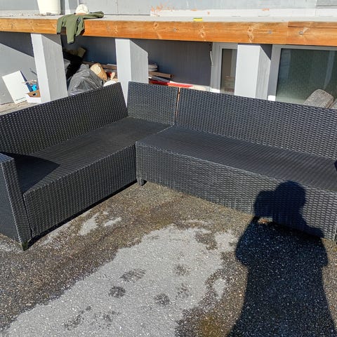 Utegrupp med kall beige stil och ryggdynor. Soffan är utformad för balkong eller inglasad uteplats och består av flera sektioner som kan ställas ihop till en hörnsoffa. Dynorna är tjocka och quiltade för ökad sittkomfort. Passar för utomhusbruk på balkong, altan eller uteplats. Bord på bilderna ingår.
