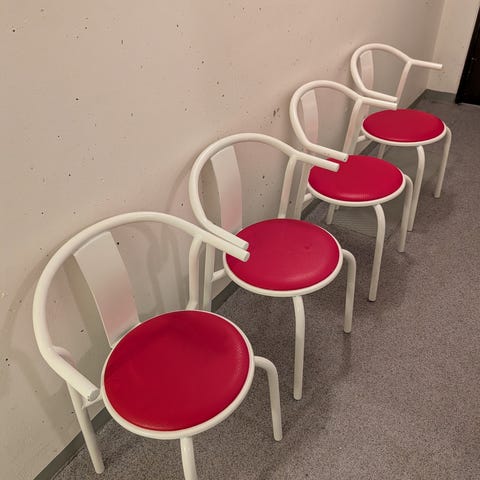 Fem röda retro stapelbara stolar, design Nikolai Wiig Hansen gjord för Ikea.