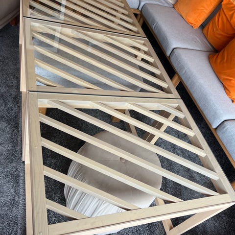 Annorlunda soffbord med underrede i ek och bordsskiva i glas. Hyllplan för exempelvis snygga böcker eller tidningar för display.