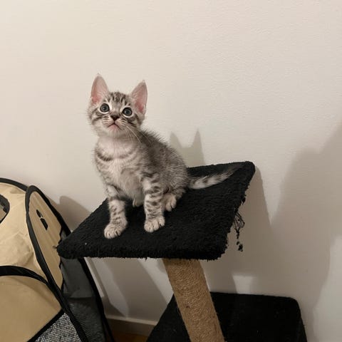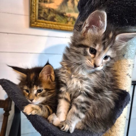 Pappan är blandning mellan ragdoll och Maine coon. Både mamma och pappan finns i hemmet. Van vid hundar och andra katter