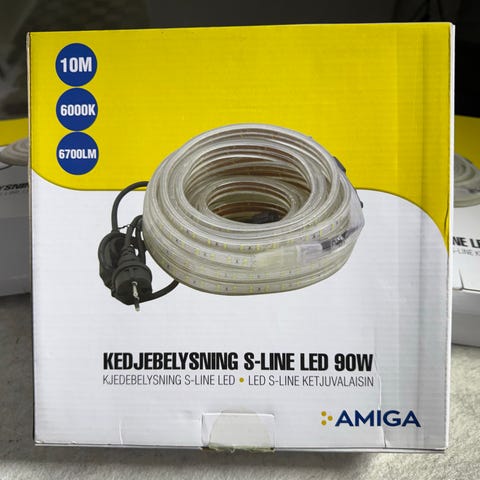 Amiga S-Line kedjebelysning LED 225W. Kedjebelysningen levereras på rulle och är avsedd för fast installation där lång sammanhängande LED-belysning behövs, till exempel i garage, lager, verkstad eller andra större utrymmen. LED-tekniken ger energieffektiv belysning med jämnt ljus längs hela kedjan. Produkten ansluts till elnät enligt medföljande installationsanvisning och är avsedd för inomhusbruk eller enligt specifikation på förpackningen.