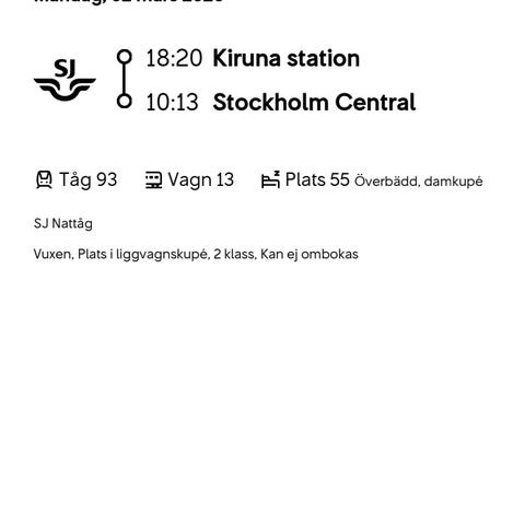 SJ tågbiljett Stockholm–Sundsvall 2mars