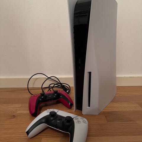 Sony Playstation 5 spelkonsol i vit färg. Stationär konsol med stöd för moderna Playstation 5-spel och bakåtkompatibilitet med många Playstation 4-titlar. Konsolen har trådlösa handkontroller av DualSense-typ enligt bild. Lämplig för anslutning till TV eller bildskärm via HDMI för spel, film och annan underhållning.