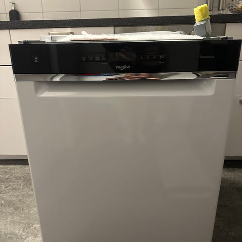 Whirlpool underbyggd diskmaskin i vit färg. Modellen är avsedd för inbyggnad under bänkskiva och har frontpanel med display och knappar upptill. Invändigt finns flera korgar för tallrikar, glas och bestick samt övre bestickbricka. Maskinen ansluts med medföljande slangar enligt standard för underbyggda diskmaskiner. Ytterkanten på ovansidan visar en mindre skada enligt bild. Passar för installation i kök där man önskar en inbyggd diskmaskin under bänkskiva.
