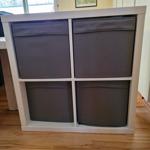 Liten, lättplacerad byrå för små utrymmen med lådor i grått tyg. Jag har gjort en liten upphöjning för att få lite mera höjd och där man kan skjuta in ett par skor eller annat.