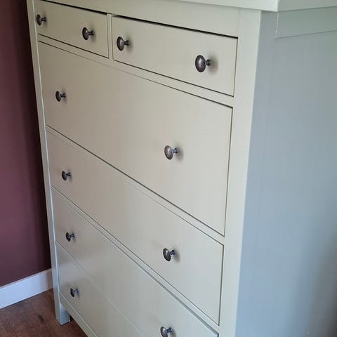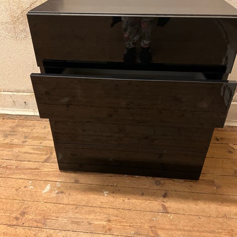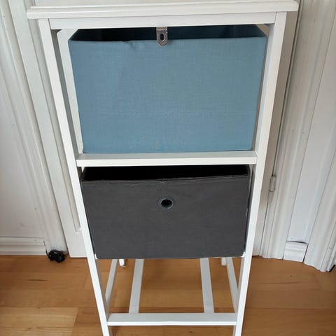 Liten, lättplacerad byrå för små utrymmen med lådor i grått tyg. Jag har gjort en liten upphöjning för att få lite mera höjd och där man kan skjuta in ett par skor eller annat. Höjd 80 cm eller 92 cm med upphöjningen, bredd 37 cm och djup 30cm.