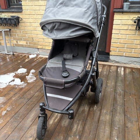 Äldre sliten barnvagn, smutsig, fungerar men ett hjul är löst går att fälla ihop