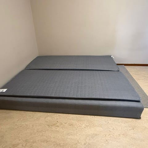 IKEA Järnudda madrass i storlek 90x200 cm. Madrassen är grå och visas här i två exemplar bredvid varandra för att bilda en större liggyta. Etiketten anger modellnamn, mått och skötselanvisningar. Passar som enkelmadrass i sängram eller som del av dubbelsäng med två madrasser. Lämplig för sovrum eller gästsäng.