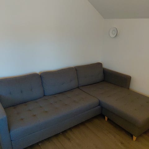 Mörkgrått tyg och plats för förvaring i schäslongen, väldigt lätt att bädda ut.