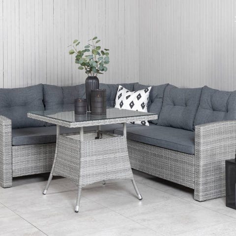 Hörngrupp utemöbler i grå konstrotting med matchande bord. Soffan har vadderade grå dynor och är utformad som en hörnsoffa för flera sittplatser. Bordet har rektangulär bordsskiva och stabilt underrede i samma konstrotting som soffan. Passar för uteplats, altan eller inglasat uterum.