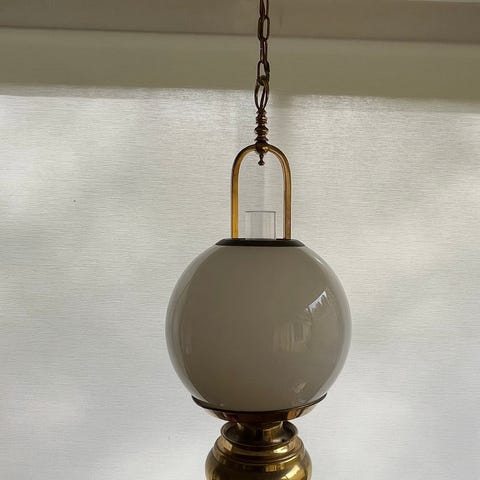Taklampa med en vit, kupad glasskärm som har ett dekorativt blomstermönster. Lampan har en justerbar höjd tack vare en spiralfjäder och en mässingsfärgad stomme. Den är utrustad med en äldre kontakt (se bild 11) varför jag inte haft möjlighet att fota den tänd. Men den är funktionstestad och fungerar.
