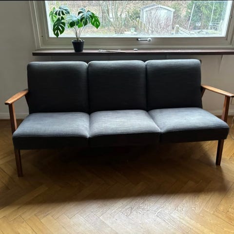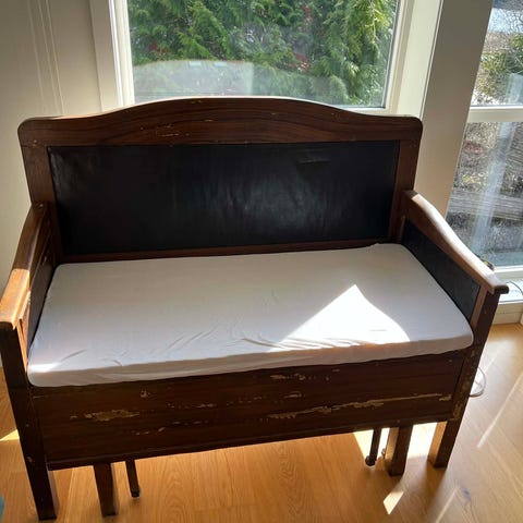 Bekväm bäddsoffa med vacker stomme i trä. I behov av renovering (slitage på sittdelen). Soffan har även en dold låda under, för förvaring.