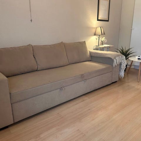 En bra bäddsoffa enkel utbäddning. Sidofack för förvaring. Väldigt bekväm att sitta i. Kommer nytvättad med maskin så finns inga fläckar.