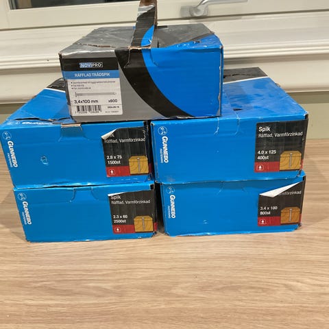 Gunnebo spik och skruv i blandat parti. På bilderna syns flera remsor spik för spikpistol samt förpackningar med skruv i plastlådor och kartonger. Lämpligt för olika typer av bygg- och snickeriarbeten där både spikpistolspik och skruv från Gunnebo behövs. Exakta dimensioner och antal framgår av respektive förpackning på plats.