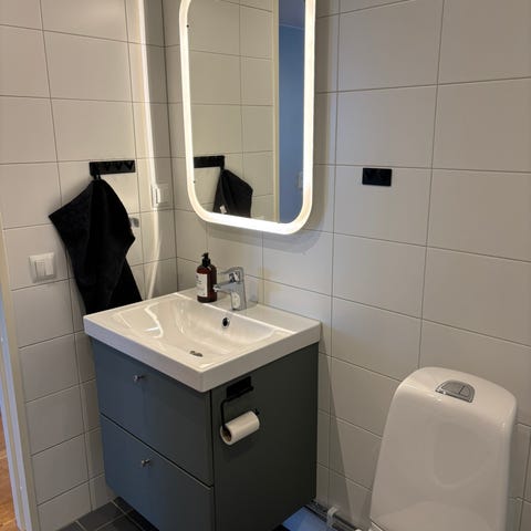 Rektangulär badrumsspegel med rundade hörn och integrerad LED-belysning runt hela kanten. Monterad på vägg med dold infästning. Passar över kommod eller handfat i badrum. Vit ljusram ger jämn belysning vid spegeln. Den här spegeln sprider ett mjukt ljus i badrummet, så att det blir lätt att vakna till och du får en bra start på morgonen. Obs! Kommoden och passande överskåp i samma färg finns också till salu se separat annons