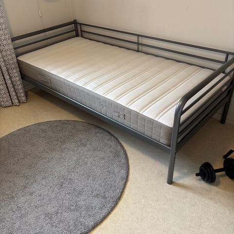 En fin och stabil säng. En resårmadrass plus två fina bäddmadrasser ingår.
