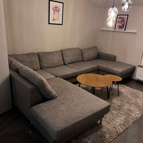 Grå 3-sits soffa med divan höger 293x200cm.