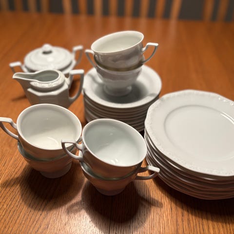 9 koppar, varav 2 st naggade i kanten, 11 kaffefat, 12 assietter, 1st sockerskål med lock och en gräddkanna.