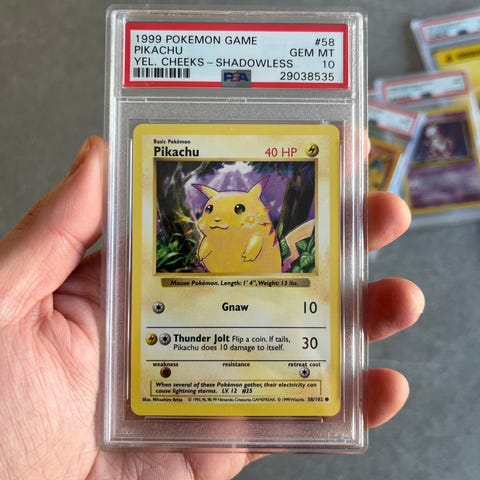 Pokémon Pikachu samlarkort på engelska. Kortet visar Pikachu med attackerna Gnaw och Thunder Jolt. Standardstorlek för samlarkort och tryckt på kartong enligt vanlig Pokémon-layout med bild på framsidan och klassisk Pokémon-baksida. Passar för samling eller spel i Pokémon Trading Card Game. Pris kan förhandlas