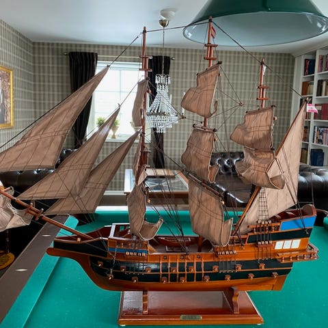Modellfartyg föreställande ett fyrmastat segelfartyg i glasmonter. Fartyget har flera master med segel och detaljerat däck. Modellen står monterad i en rektangulär glas- eller plexiglaslåda med bas, lämplig för placering på hylla eller bord som prydnadsföremål eller samlarobjekt.