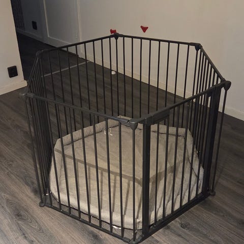 BabyDan lekhage i vit färg med mjuk madrass i botten. Lekhagen har höga, täta spjälor och är utformad för att ge ett avgränsat och säkert område för små barn att leka eller vila i inomhus. Passar exempelvis i vardagsrum eller barnrum där man vill skapa en tydlig lekyta.