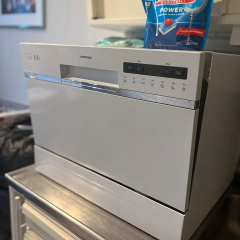 Fristående bänkdiskmaskin som placeras på bänk eller annan plan yta. Invändigt finns diskbackar och bestickkorg anpassade för mindre hushåll eller där det saknas plats för fullstor diskmaskin. Maskinen har frontpanel med vred och knappar för programval samt display för grundläggande information.