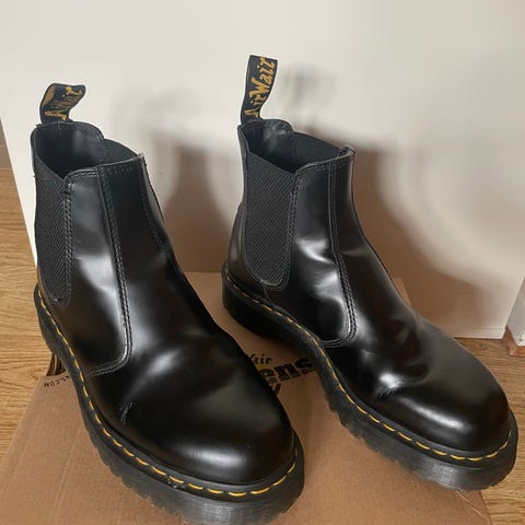 Dr. Martens stövlar i storlek 42. Modellen är svarta chelseaboots i svart läder. Grov sula med Dr. Martens karakteristiska gula söm. Levereras med originalkartong enligt bild.