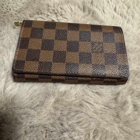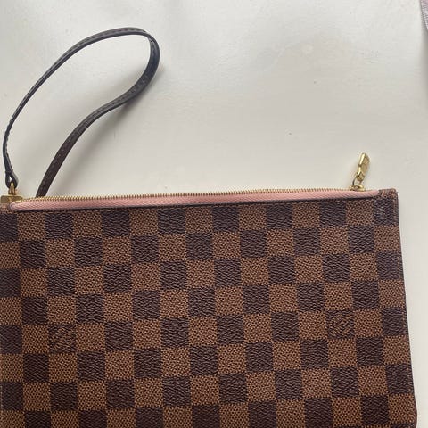Säljer en elegant Louis Vuitton necessär i klassiska Damier Ebene (brun/svart rutmönster) med vacker röd insida. Perfekt som sminkväska, reseförvaring eller clutch.