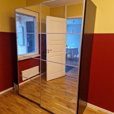 Säljer en rymlig IKEA PAX garderob med skjutdörrar- ena sidan vit, den andra spegel.