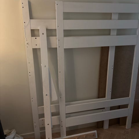 Sängen har två bäddar placerade ovanpå varandra och är utrustad med stege samt skyddskanter på övre bädden.