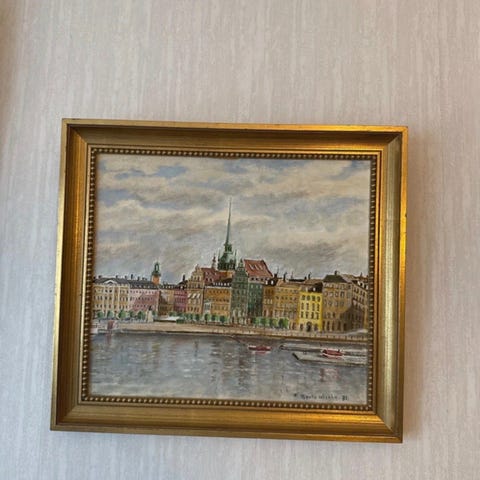 Oljemålning föreställande Kornhamnstorg i Stockholm. Reproduktion