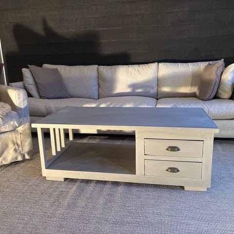 Soffbord i trä med rektangulär bordsskiva och två infällda svarta skivor. Bordet har en underhylla för extra förvaring. Passar som vardagsrumsbord eller soffbord i hemmiljö.