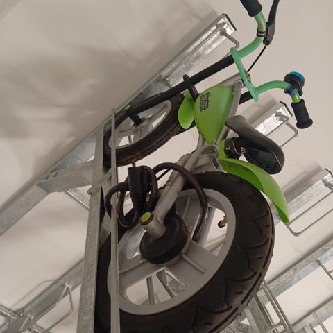 Två styltor i glada färger säljes. Köparen. Står för frakten.