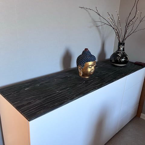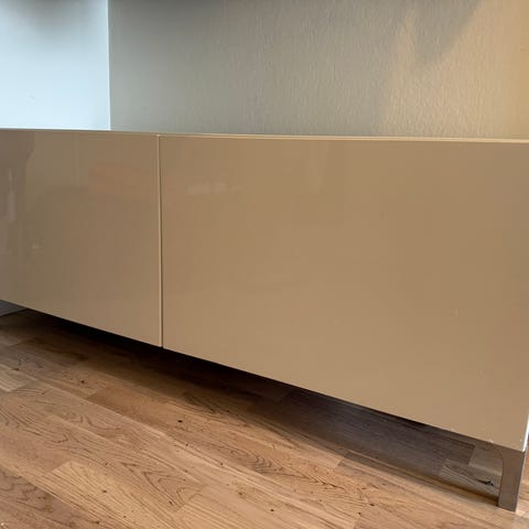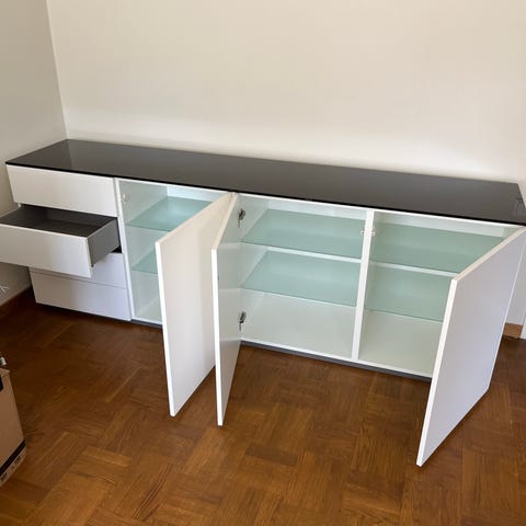 Sideboard i högblank vit. Fyra luckor. En flyttbar hylla i varje skåp. Tung och stabil. Fint använt skick med några små fläckar som inte går bort.