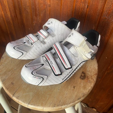 Cykelskor storlek 44 små storleken med ovandel i orange och vit syntet/mesh. Skorna har tre kardborreband över foten för enkel på- och avtagning samt justerbar passform. Yttersulan är mönstrad för bättre grepp. Passar för vardagsbruk eller lättare träning.