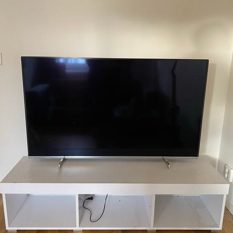 TV-bänk i trä med fyra skåpsdörrar och två lådor.