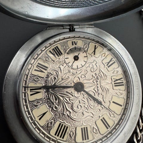 Silverfärgat mekaniskt fickur med analog urtavla och arabiska siffror. Urtavlan har separat liten sekundvisning. Baksidan har graverat mönster. Passar som bruksföremål eller samlarobjekt för den som är intresserad av äldre mekaniska klockor.