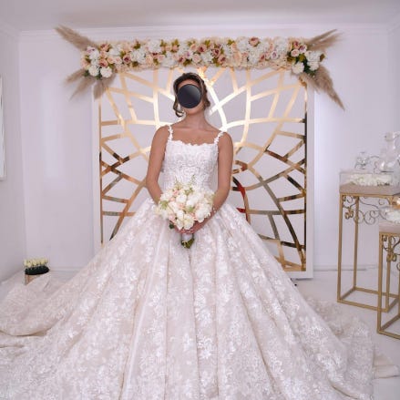 Ny pris 23995 kr (klänningen) 1495 kr (brudslöjan) 2000 kr (undertröjan) 2000 kr (accessoarer) 295 kr (vit sjal), nypris TOTALT 29785 kr.