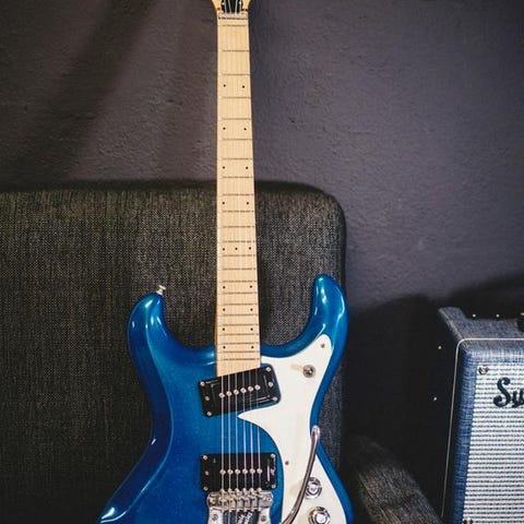 En prs se Mira, uppgraderad med EMG 81/85- mikrofoner och elektronik från EMG. Wraparound-brygga med mässingssadlar. Gigbag från Prs medföljer.