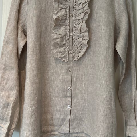 Vailent skjorta för dam i storlek M. Skjortan är beige och tillverkad i linne. Modellen är kort, har klassisk krage, lång ärm och knäppning fram.