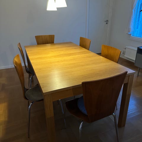 Matbord med två iläggsskivor och sex stolar