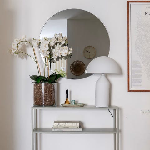 Det är en stilren rund väggspegel med metallram och svart baksida som ger ett elegant uttryck i hall, vardagsrum eller sovrum.
