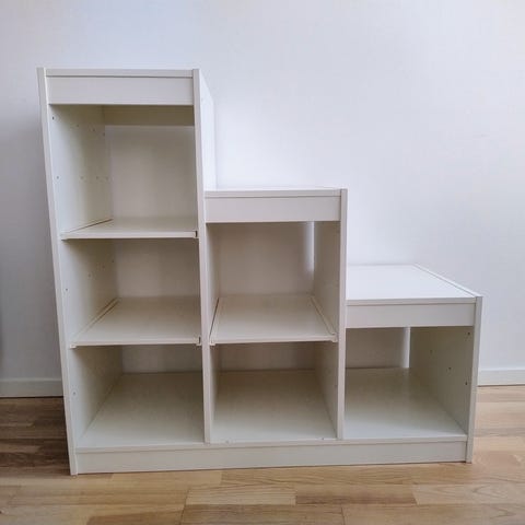 IKEA förvaringsmöbel Trofast för barn med flera utdragbara plastlådor i vitt. Möbeln är låg och anpassad för barn, med öppna fack där lådorna kan tas ut och sättas in. Passar för förvaring av leksaker, pyssel eller andra barnrelaterade saker i barnrum eller lekhörna. Ytan upptill kan användas som avställningsyta. Vit stomme med vita plastlådor.