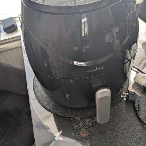 Wilfa fritös i vit färg. Modellen har öppningsbart lock upptill och uttagbar friteringskorg. På framsidan finns reglage för temperatur samt indikatorlampor. Passar för fritering av till exempel pommes frites och andra livsmedel i hemmet.