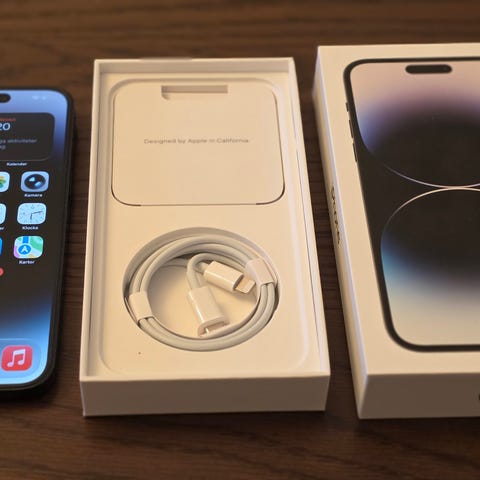 I förpackningen syns originalkartong, USB‑C till Lightning‑kabel samt verktyg för SIM‑kortsöppning. Ett separat mobilskal i mönstrad design ingår enligt bilderna.