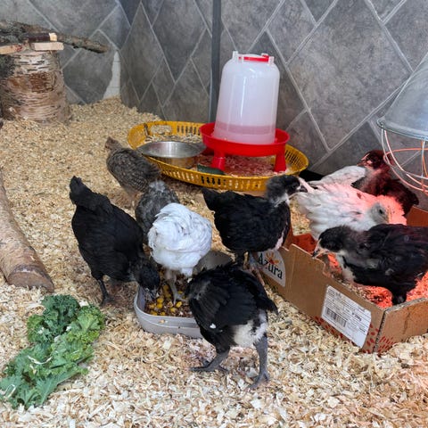 De är 5 veckor gamla nu och behöver värmelampa i 2-3veckor till , man kan hämta de nu eller boka nu och hämta när de slutat med värmelampa🐔