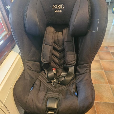 Bakåtvänd bilbarnstol med 5-punktssele och justerbart huvudstöd. Stolen monteras med bilens trepunktsbälte och stödben samt förankringsband. Klädsel i svart tyg. Tillverkad 4/8-2020.