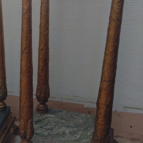 Stilren piedestal i grönaktig marmor med guldfärgat stativ.