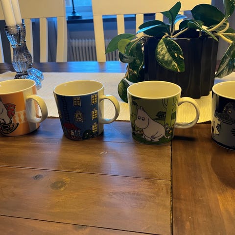 Arabia Mumin muggar i porslin med flerfärgade motiv. Muggarna har olika Muminfigurer tryckta runtom och vit insida. Passar för servering av varma och kalla drycker i kök och vardagsrum. Tål normalt dagligt bruk och kan användas både enskilt och som del av en samling Muminmuggar från Arabia.